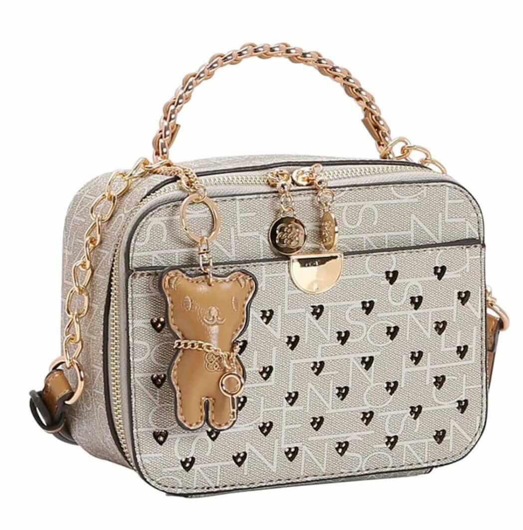fechamento com zíper forro em tecido personalizado compartimento para pequenos objetos bolso interno detalhes na frente de coração com cristais alça em poliuretano com detalhe acorrentada acabamento em costura contrastante acompanha Chaveiro Ursinho Chenson Removivél