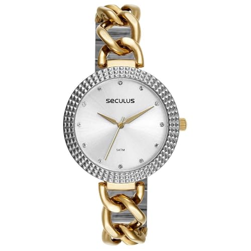 Este relógio analógico com folheação prata e dourada é uma peça sofisticada que combina estilo e funcionalidade. O modelo apresenta uma pulseira que mescla uma parte em estilo corrente e outra parte regular, equipada com um prático fecho de acionamento lateral, garantindo conforto e segurança no uso. A caixa em metal mede 4 cm de diâmetro e é adornada com uma catraca texturizada, enquanto o mostrador é embelezado com marcações em cristais, proporcionando um toque de brilho e elegância. Projetado para se adaptar confortavelmente a todos os tamanhos de pulso, ele oferece um ajuste ideal, especialmente para pulsos médios e maiores. Este relógio é a escolha perfeita para quem deseja adicionar um acessório refinado ao seu visual.