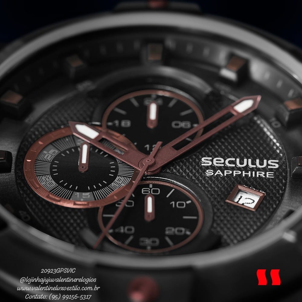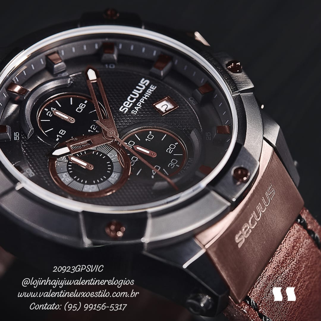 Com design robusto, este relógio possui função cronógrafo, com vidro de safira mais resistente a riscos. Sua caixa é em aço com mostrador 3D e catraca com parafusos. Pulseira em couro marrom, veste bem até pulsos maiores. Esse relógio possui a caixa em 4,8 cm de tamanho.