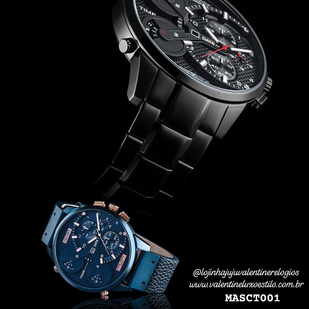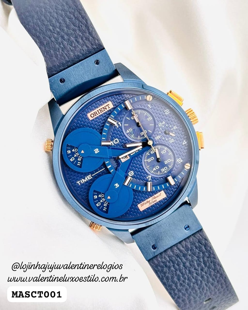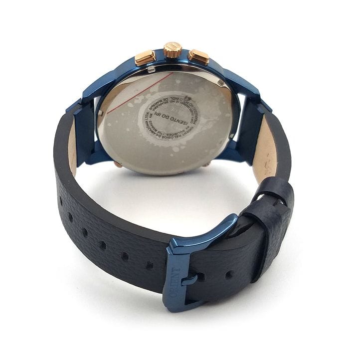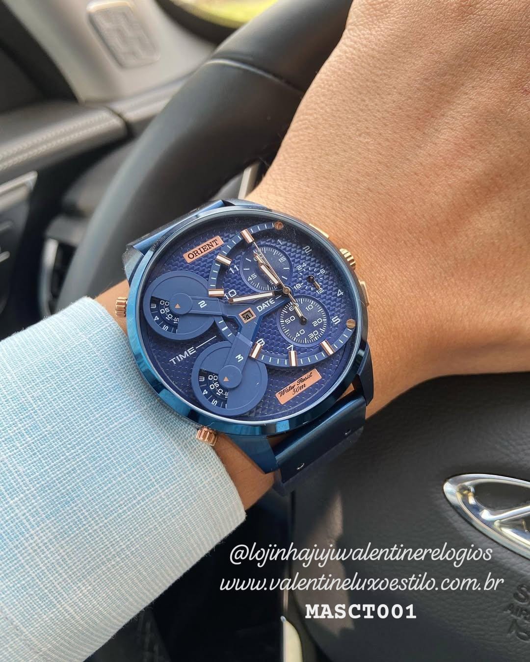 Relógio Masculino Orient Cronógrafo – MASCT001 D2DX. É um relógio com 52 mm de largura. Possui resistência à água de 5atm. Com essa classificação o relógio é resistente às ocasiões mais comuns como chuva, lavar as mãos e tomar banho de chuveiro por exemplo. Sua caixa em aço e pulseira em couro, seu vidro é de cristal mineral e possui mostrador azul. Seu funcionamento é Analógico.