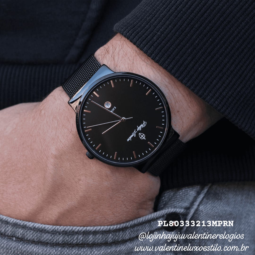 Relógio Phillip London Masculino Ref: Pl80333213m Pr N Casual Black DESCRIÇÃO DO PRODUTO: Caixa de Metal Pulseira de Malha de Aço Mesh Vidro de Cristal Mineral Fundo de Pressão Resistente à Água 5 Atm Diâmetro / Largura da Caixa: 41.00 MM Funções: Analógico, Calendário Design Inglês Estilo: Esporte Fino Alimentação do Maquinário: Bateria Linha: Philiph London Shelby Mostrador Preto Garantia de 1 ano